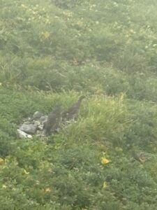 中腹まで降りてきて、先ほどまでの風が嘘のように収まってきた。雷鳥沢はそよ風で、霧がゆっくりと流れていく。そんな時、低い茂みに雷鳥の親子を見つけた。初めは、親たちが周りを警戒して辺りを見回していたが、危険がないと判断して鳴き声を発すると小さな子供たちがヒョコヒョコと茂みから出てきた。産毛はもう生えてはいないが、体格は親の半分ほどだろうか。