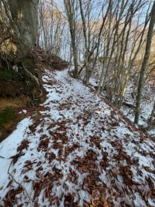 中腹を過ぎると、日陰に雪が浅く積もっている。