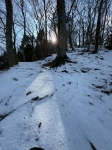 すっかり木々の葉が落ちた山道は明るく、木立の間からは日が差し、凍り付いた雪がサクサクと音を立てる。